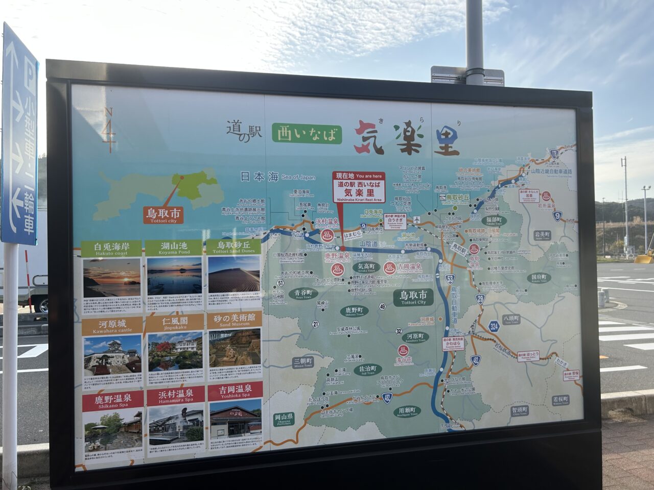 山陰自動車道の浜村鹿野温泉ICを降りてすぐの場所にある道の駅「西いなば気楽里(きらり)」は、新鮮な地元野菜や特産品が豊富に揃い、無料の足湯も楽しめるスポットです。施設内にはレストランやコンビニエンスストアも併設されています。